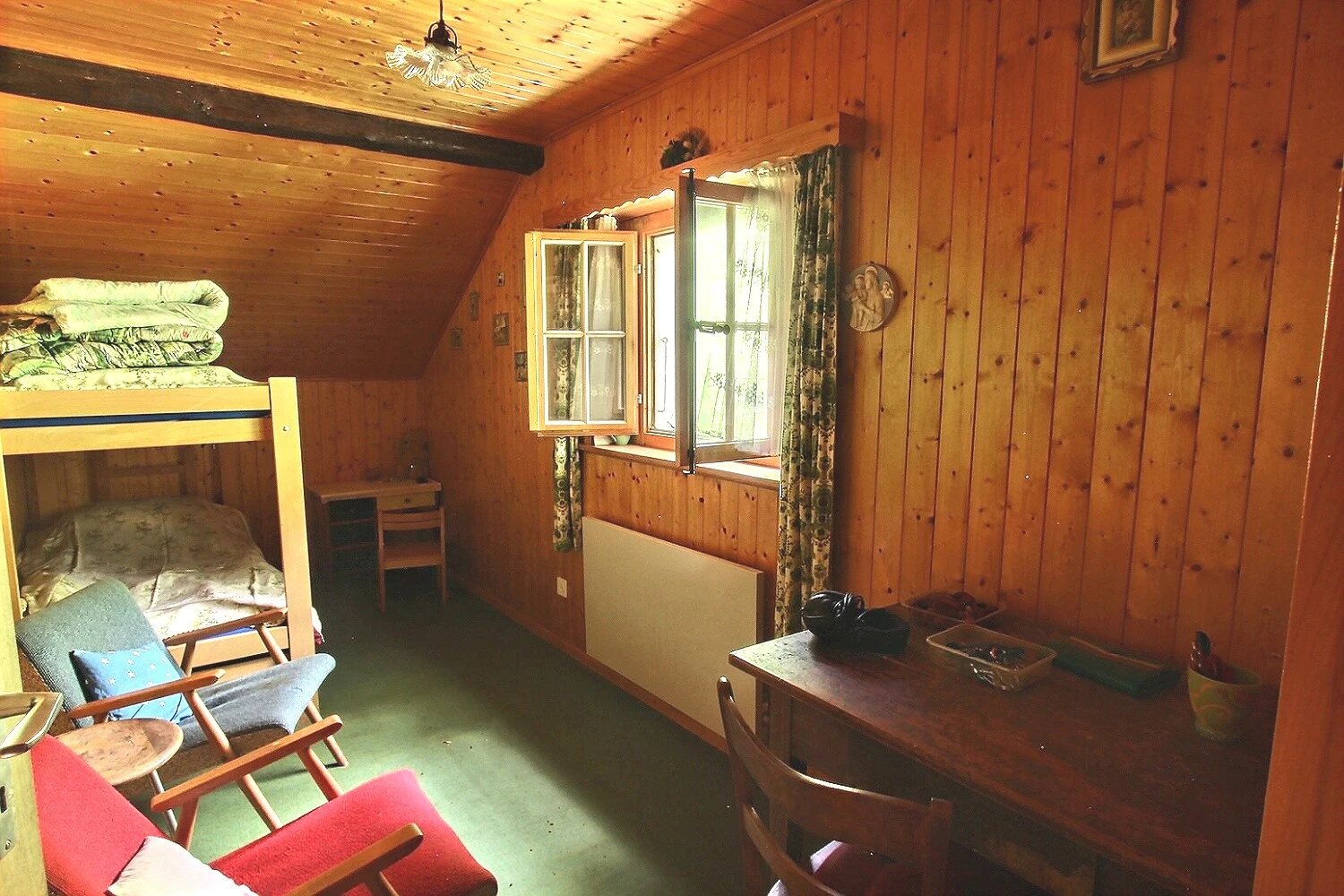 Radiateurs électriques dans toutes les pièces. Cheminée au salon et four à bois à la cuisine.
